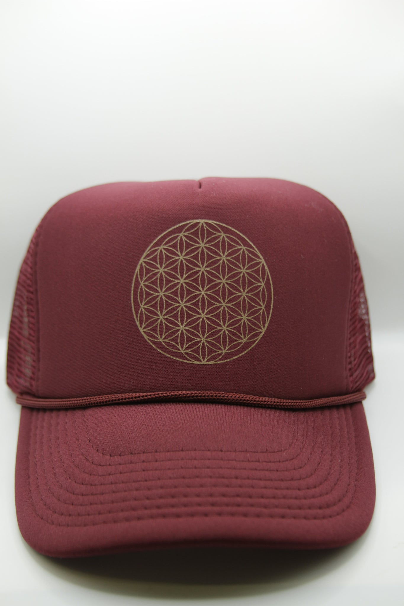 Flower of Life Trucker Hat Olive with gold ink. One Size with adjustable strap.Printed in Santa Barbara