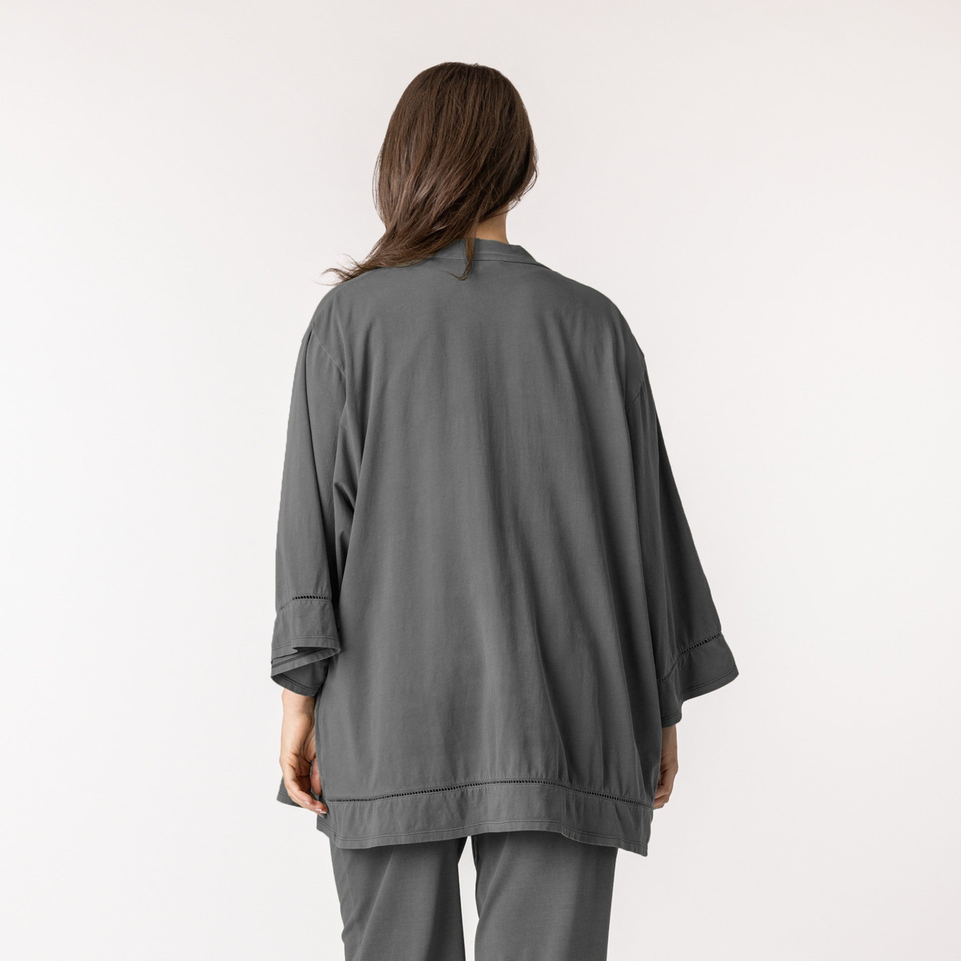 Maggie’s super versatile Kimono is made from our buttery soft 90% organic cotton jersey. Pair with the Slouch Tee and Lounge Pant or Short for the ultimate organic Lounge set or wear it out with your favorite jeans. Includes side pockets, long wide sleeves, Indian ladder lace at sleeve and bottom openings, and an embroidered Maggie’s leaf.